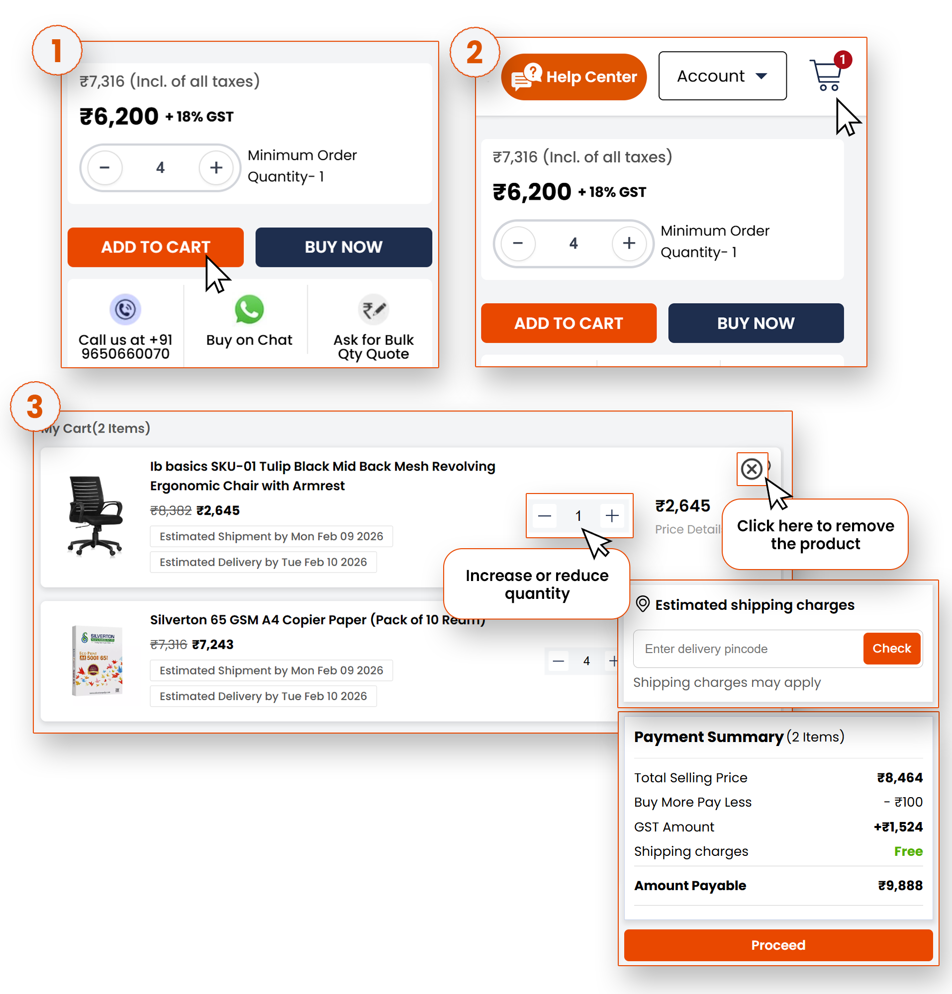 Here, you can see all the items you’ve added; you can adjust quantities (shown in the image below), or even remove any unwanted products.